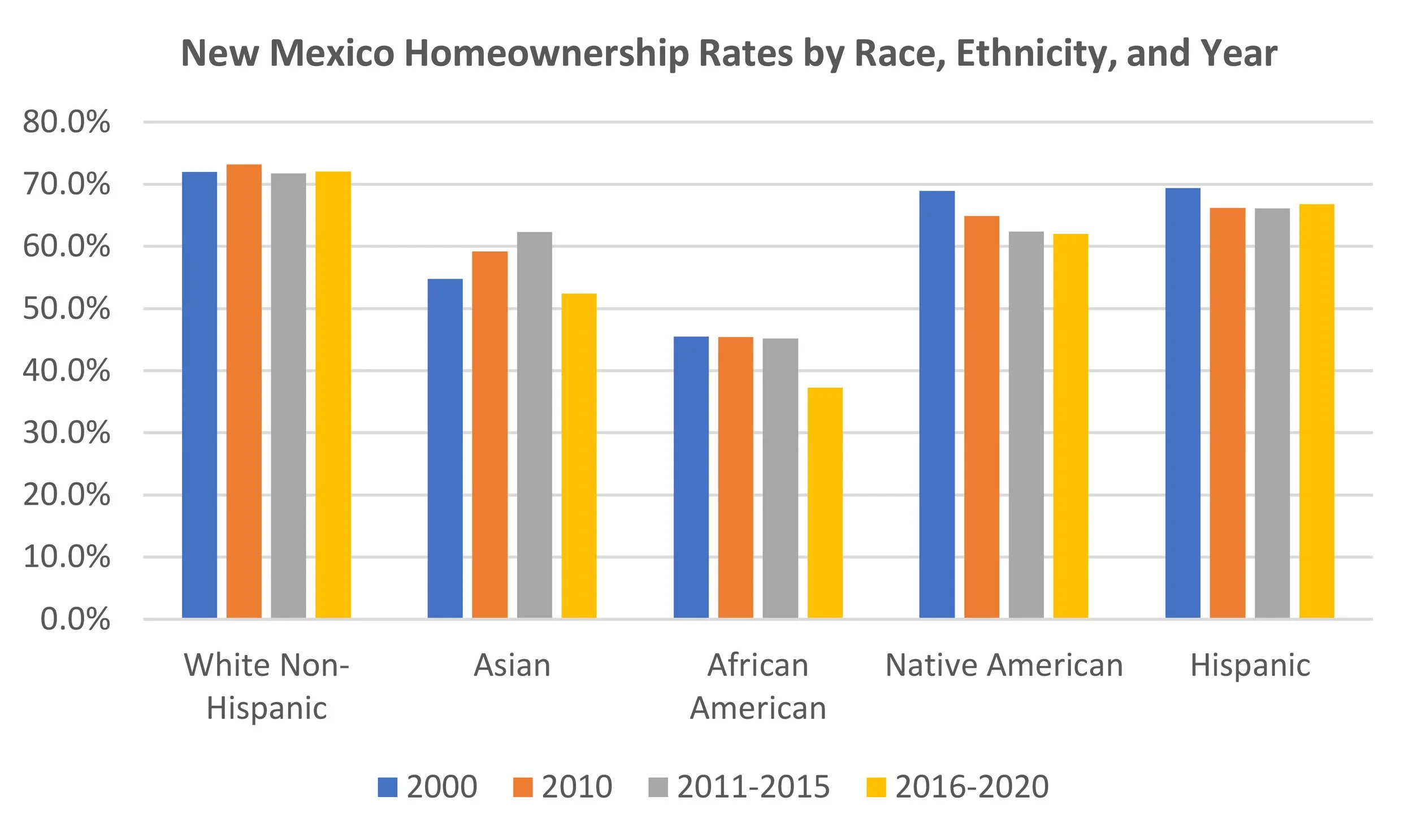 Homeownership is the primary means by which US households build wealth. Racial differences in homeownership rates, while not responsible for the wealth gap, contribute greatly to its size and persistence. Reducing the racial homeownership gap by equalizing access to high-quality loan products, down payment assistance, and a variety of neighborhoods and housing types will enable states like New Mexico to make meaningful progress toward a more equitable and sustainable distribution of wealth.