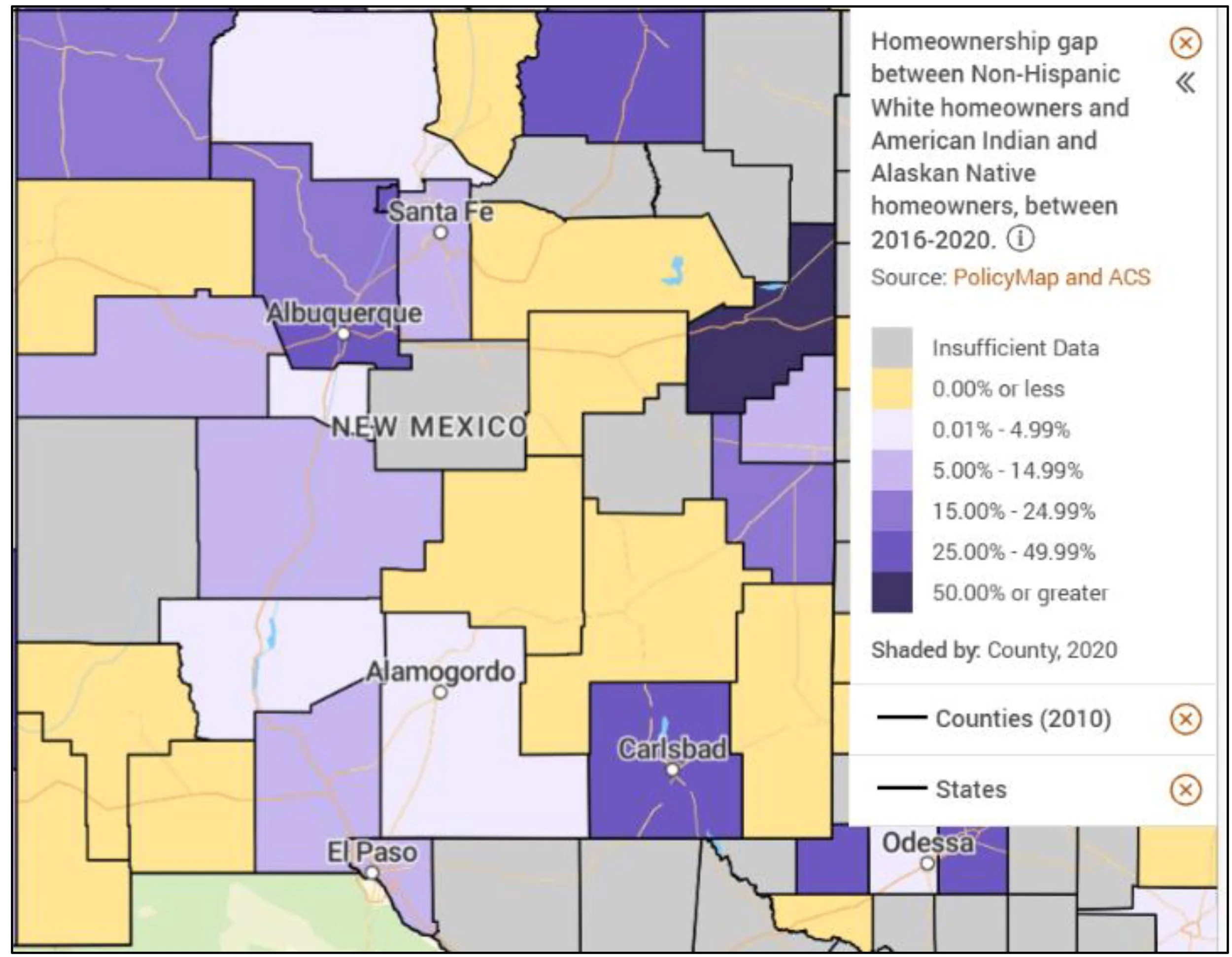 In 2021, Homewise engaged PolicyMap™ to map the racial homeownership gap by city, county, and state in New Mexico and nationwide. The map tool, available on the Homewisdom website, shows how the rate of homeownership among households of color (HOC) compares to that of White non-Hispanic households (White households) at the city, county, and state levels, enabling users to visualize the magnitude of the racial homeownership gaps in their community and compare their community to others nationwide.