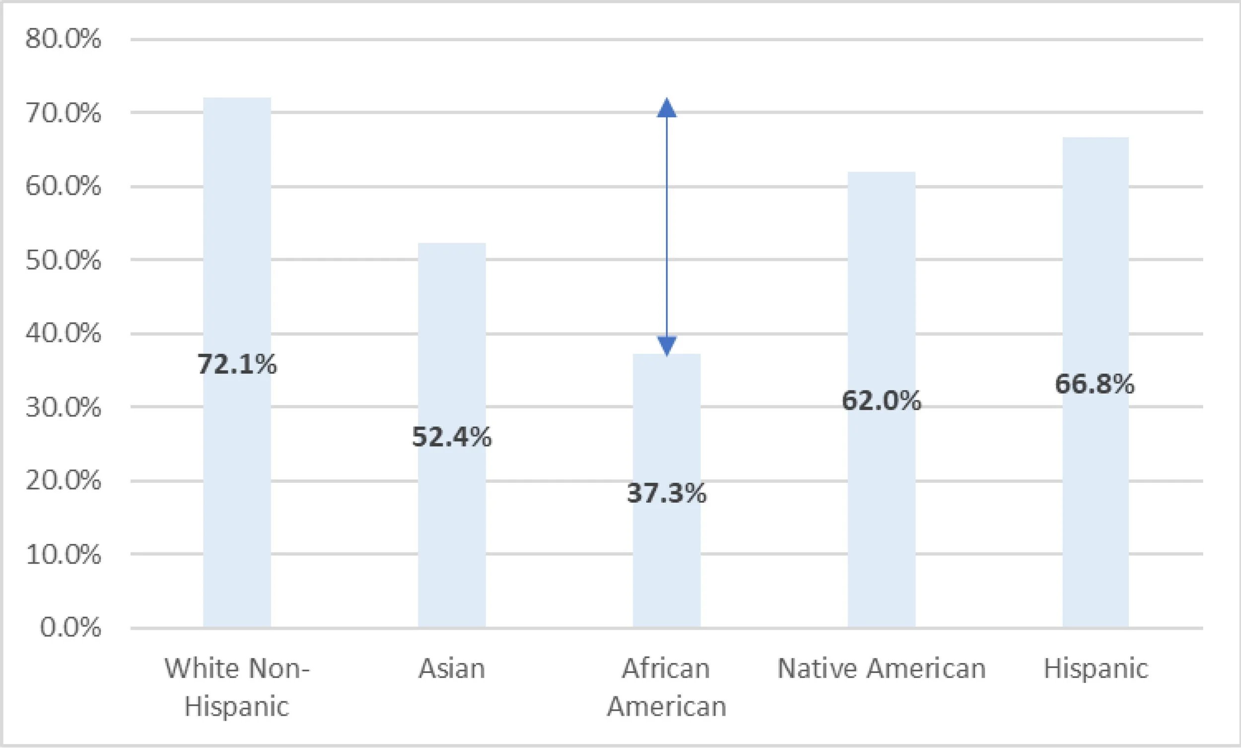 In every US state except Hawaii, rates of homeownership by White households exceed those of non-White households. Nationally, homeownership by households of color lags behind White homeownership by 22.6 percentage points.