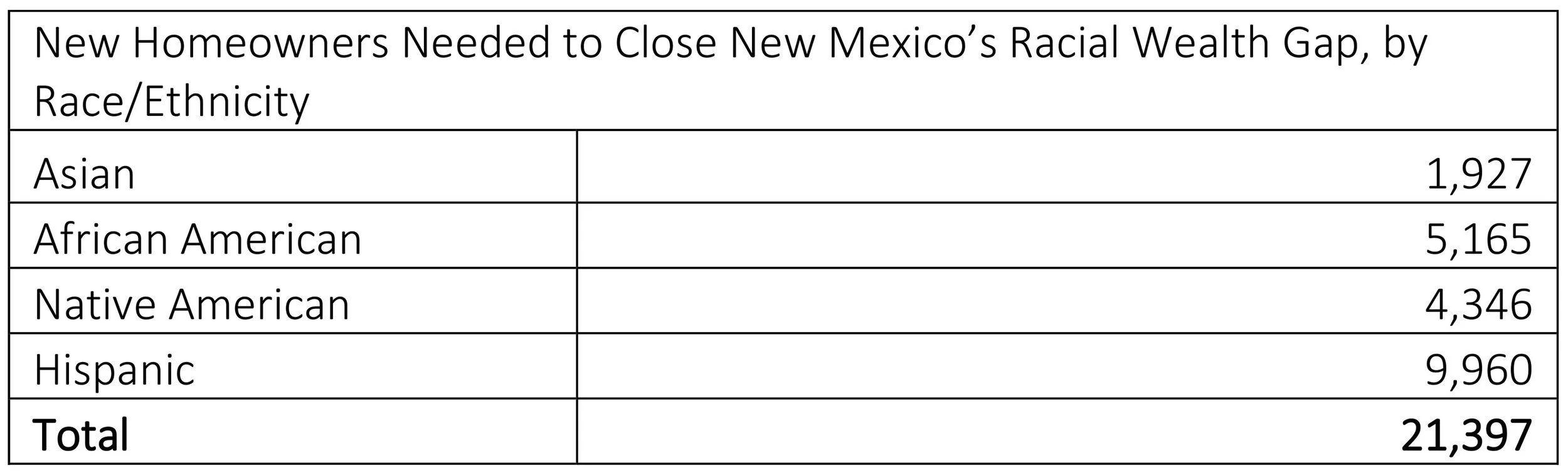 A 9% increase in minority homeownership would close New Mexico’s racial homeownership gap. This can be accomplished by facilitating home purchases by 21,397 (roughly 1-in-6) non-White renter households. Table 1 shows the number of additional homeowner households needed to close the racial homeownership gap in New Mexico.